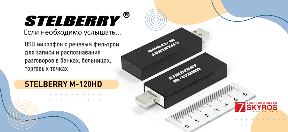 Корпорация СКАЙРОС, официальный дистрибьютор торговой марки STELBERRY, представляет вам новинку – USB микрофон с речевым фильтром STELBERRY M-120HD для записи и распознавания разговоров в различных учреждениях.